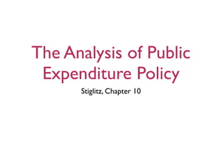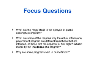 The document outlines 10 steps for analyzing public expenditure programs: 1) identifying the need for the program, 2) the market failure addressed, 3) alternatives to the program, 4) design features and eligibility standards, 5) private sector responses, 6) efficiency consequences like substitution and income effects, 7) distributional consequences and who benefits, 8) equity-efficiency tradeoffs, 9) other public policy objectives, and 10) considering how the political process shaped the program. It provides examples to illustrate several steps, such as how subsidies may crowd out private support or how price controls can impact supply.