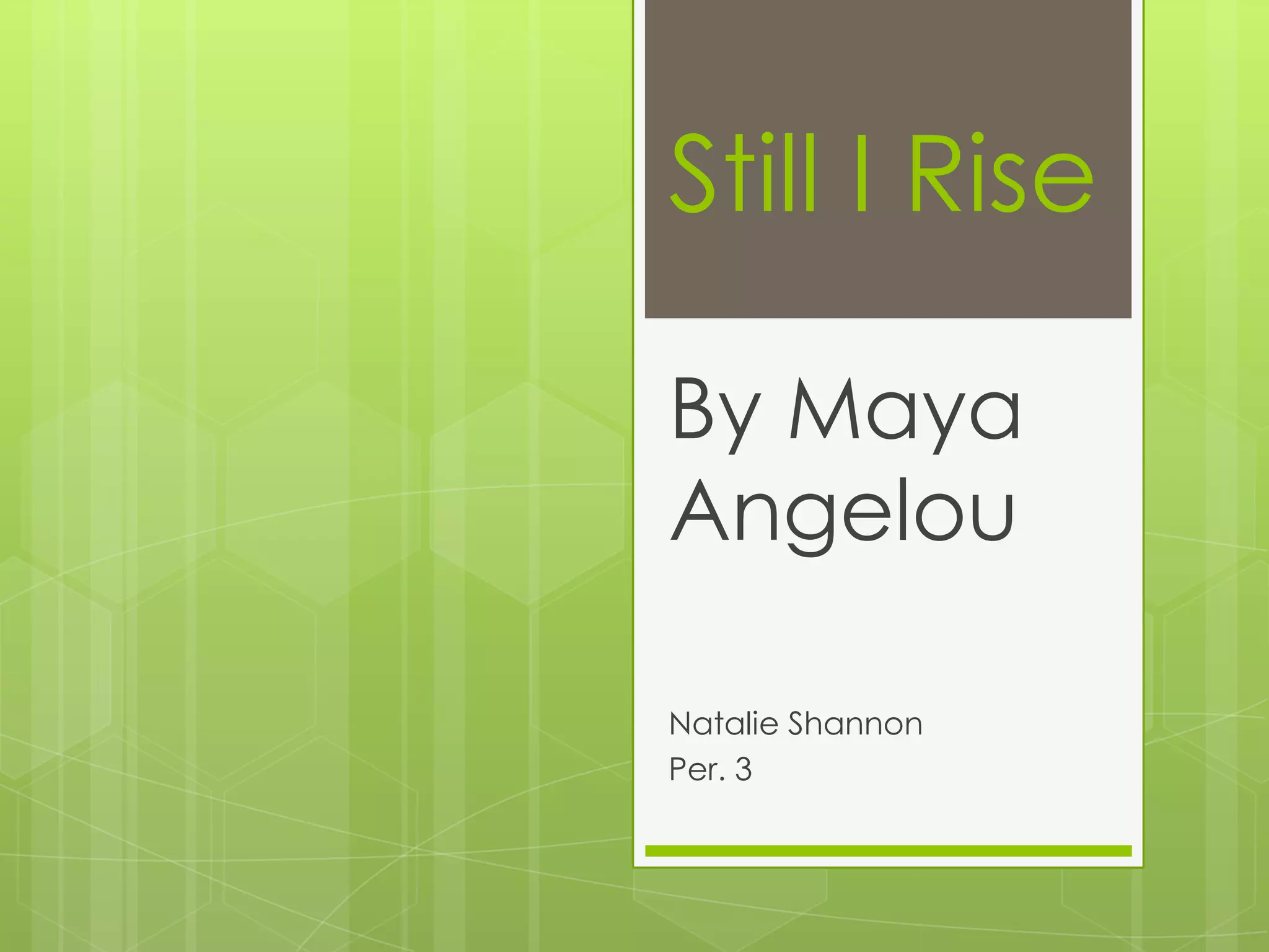 The poem is told from the first-person perspective of a woman who is confidently addressing her critics. She states that though others may try to oppress her through words or actions, she will still rise up like dust or air. The speaker repeats the phrase "Still I'll rise" to emphasize her perseverance. The poem concludes by saying the speaker rises up from a painful past, bringing the gifts of her ancestors, as she is the dream and hope of slaves.