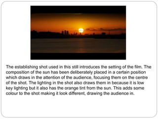 The establishing shot introduces the setting and uses lighting and composition to draw attention to the center. An over-the-shoulder shot shows conversation and expressions while also hinting at the scene's lighting and location. Later, the screen fades to black for a long time, suggesting something dangerous or different may happen. Additional shots showcase reviews, the cast, and studios to promote the film.