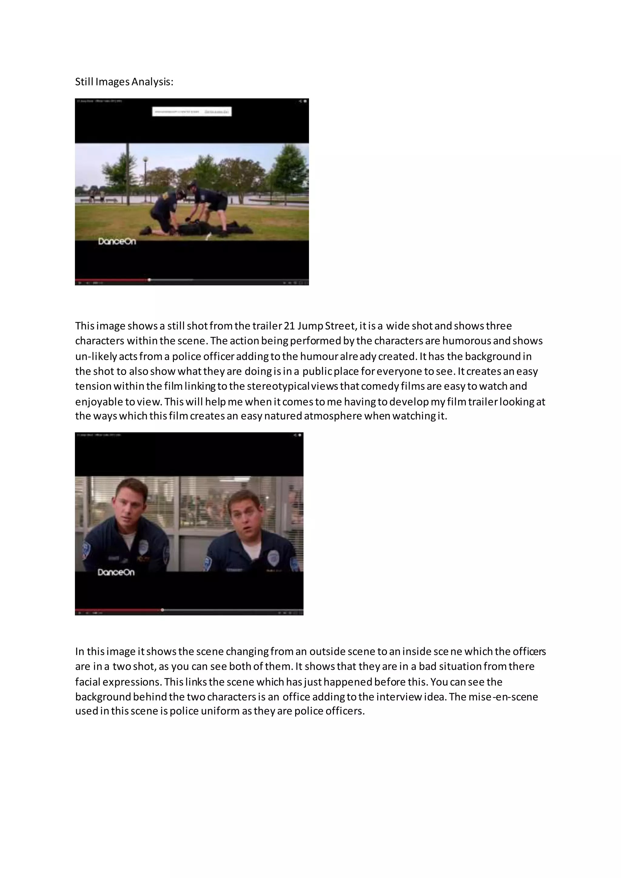 This document analyzes still images from the trailer for the movie 21 Jump Street. The first image shows three characters engaged in a humorous act that subverts expectations of police officers. It establishes the comedic and light-hearted tone of the film. Subsequent images show the characters in different settings and costumes that further the plot and humor, such as wearing police uniforms in an abandoned warehouse or school clothing when they are supposed to be undercover at a school. The analysis examines how the mise-en-scene and progression of scenes in the trailer effectively set up the comedy genre conventions used in the film.