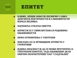 Документ описује различите стилске фигуре у књижевnosti, као што су епитет, компарација, метафора и алегорија, објашњавајући њихове функције и значај у стварању поетских слика. Примери сваке фигуре и њихова употреба у литератури и поезији илуструју технике које аутори користе за изражавање емоција и стварање значења. Поменуте стилске фигуре укључују контраст, персонификацију, хиперболу и иронију, дајући читатељима увид у креативне алатке које књижевна дела могу садржавати.