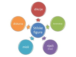 Dokument se bavi različitim stilski figurama u jeziku, uključujući figure dikcije, konstrukcije i misli, te pruža primjere za svaku figuru kao što su aliteracija, anafora, metafora i paradoks. Ove figure se koriste za naglašavanje emocija, stvaranje ritma i jačanje izraza u govoru i pisanju. Osim toga, objašnjava se kako se figure koriste u različitim kontekstima i stilovima.