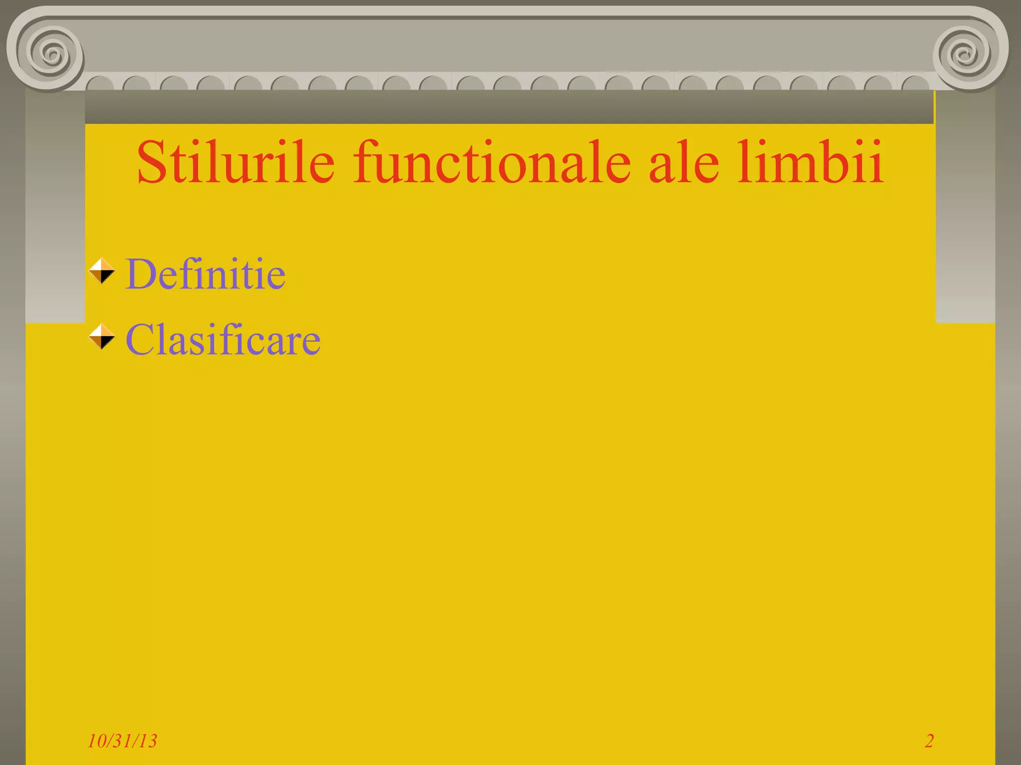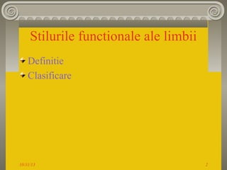Documentul oferă o clasificare a stilurilor funcționale ale limbii, incluzând stilul științific, juridic-administrativ, jurnalistic, beletristic și colocvial. Fiecare stil are caracteristici specifice, cum ar fi formalitatea, lexicalitatea bogată în neologisme sau utilizarea limbajului conotativ. Stilurile sunt utilizate în diverse domenii de activitate și se adaptează funcției comunicative necesare.