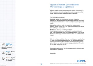 The document provides guidance on planning and facilitating effective workshops. It shares lessons learned from over 1500 workshops conducted by Stimmt AG over 15 years. The key aspects of workshop planning covered are defining the goal, inviting participants, preparing materials and documentation, and creating an agenda. Tips for workshop facilitation include introducing participants, setting expectations and rules, using warm-up exercises to build engagement, and maintaining structure through visual aids and time management. The overall message is that thorough preparation and skilled facilitation are essential for workshops to achieve their goals.