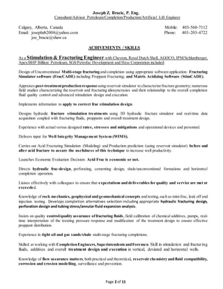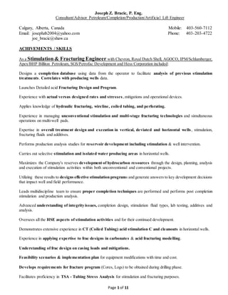 This document lists the extensive skills and achievements of Joseph Z. Bracic as a stimulation and fracturing engineer. He has expertise in designing hydraulic fracturing programs, acid fracturing, production analysis, and overseeing the safety of stimulation activities. His experience includes working with major oil companies and developing expertise in unconventional reservoirs, horizontal completions, and stimulation of tight oil and gas formations.