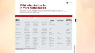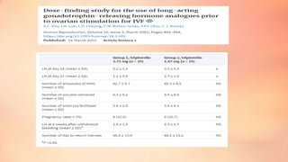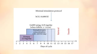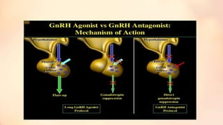 The document discusses ovarian stimulation protocols in assisted reproductive technology (ART), focusing on the use of GnRH agonists and antagonists. It covers the mechanisms of action, routes of administration, and various protocols for maximizing oocyte retrieval, along with specifics on dosing and monitoring responses during treatment cycles. Key advantages and drawbacks of different protocols are highlighted, including the effectiveness and risks associated with ovarian stimulation.