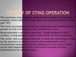 The document discusses sting operations, including their origins, legal issues raised, and guidelines/cases related to their use and legality in India. Some key points: