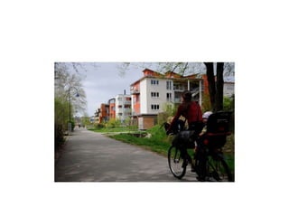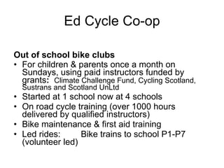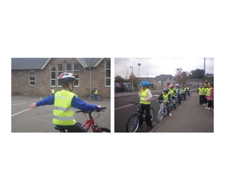 The document discusses various programs and initiatives to promote cycling. It describes out-of-school bike clubs for children and parents funded by grants that provide bike training and maintenance. It also discusses initiatives like bike trains to school, traffic management around schools, and on-road and off-road cycle training programs that have increased cycling rates. Finally, it summarizes infrastructure and policy examples from places like Germany, the Netherlands, and Colombia that have high rates of cycling through measures like separated bike facilities, traffic calming, and closing streets to cars.