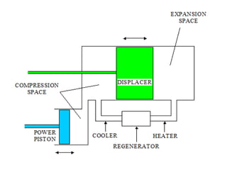 - Descriptions of the key components of Stirling engines like the heat source, displacer, regenerator and their functions.