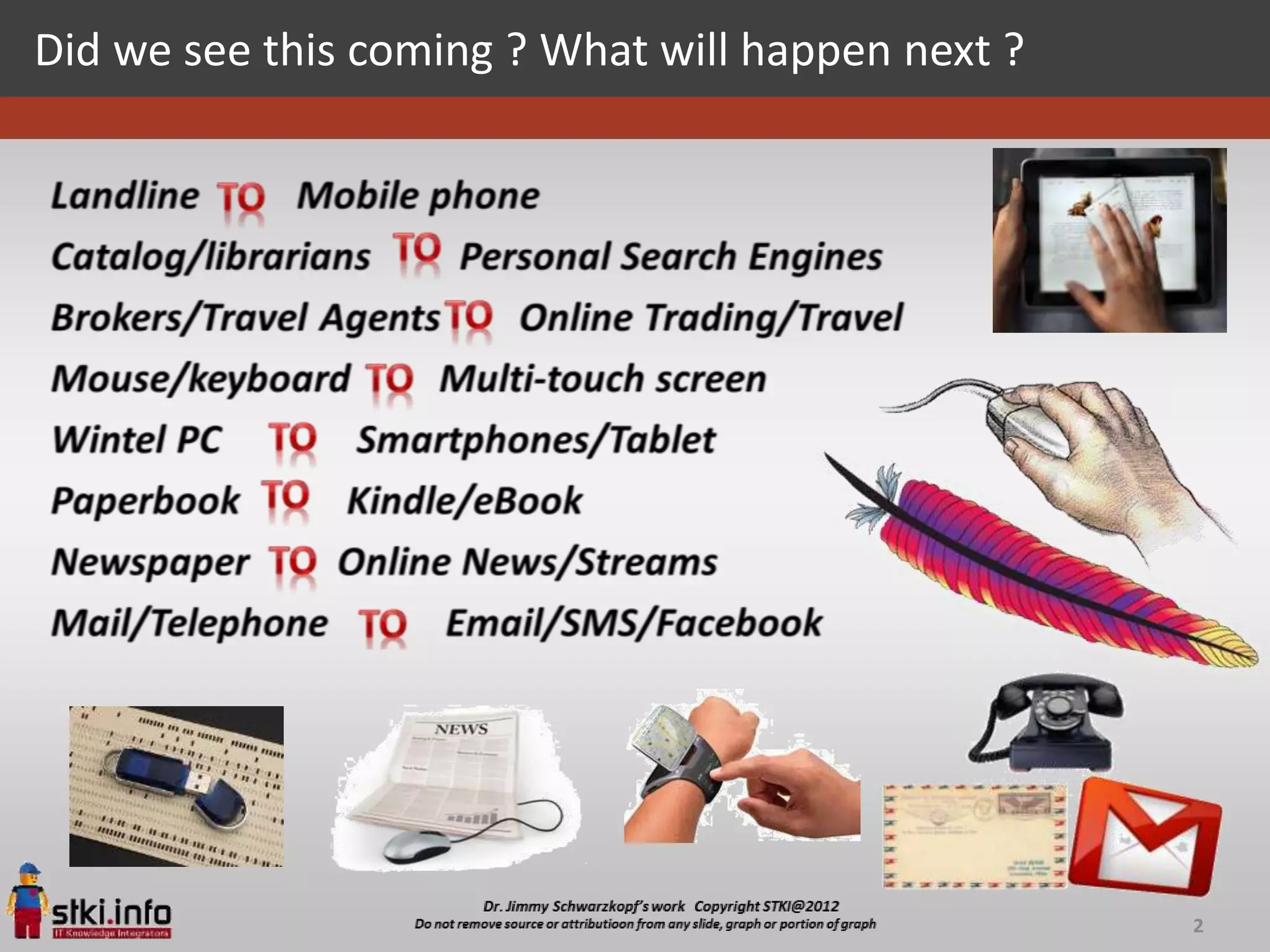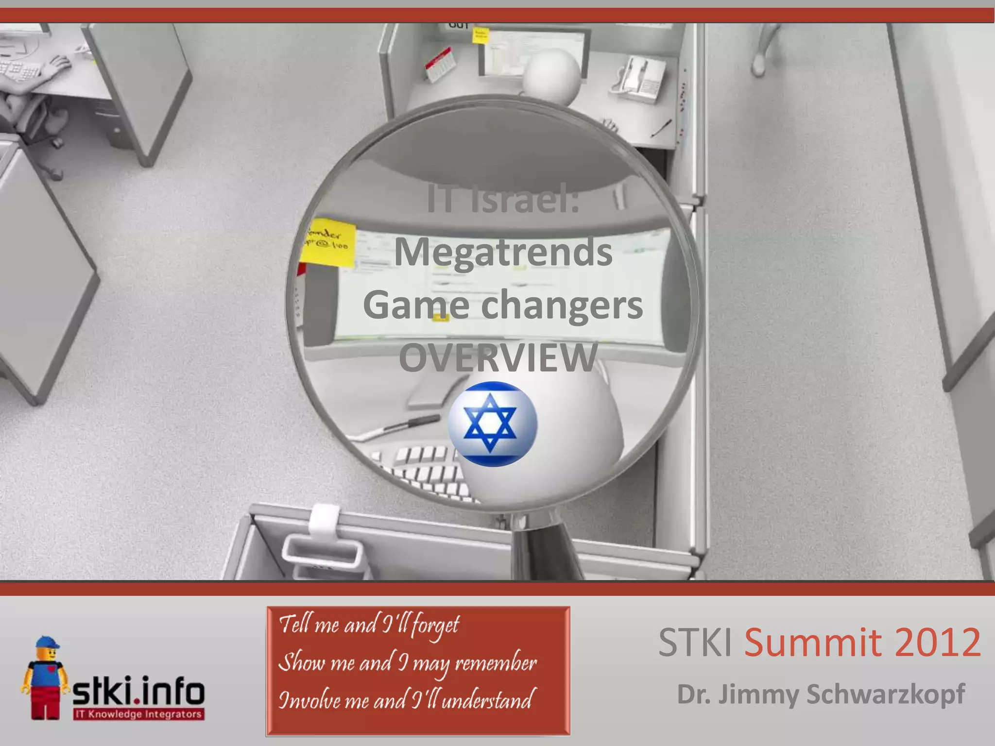 The document presents insights from the STKI Summit 2012, highlighting megatrends and game changers in technology and business. Key themes include consumerization of IT, the rise of mobile devices, and the importance of data management in the modern economy. It emphasizes the necessity for businesses to innovate and adapt to rapidly changing market conditions or risk obsolescence.