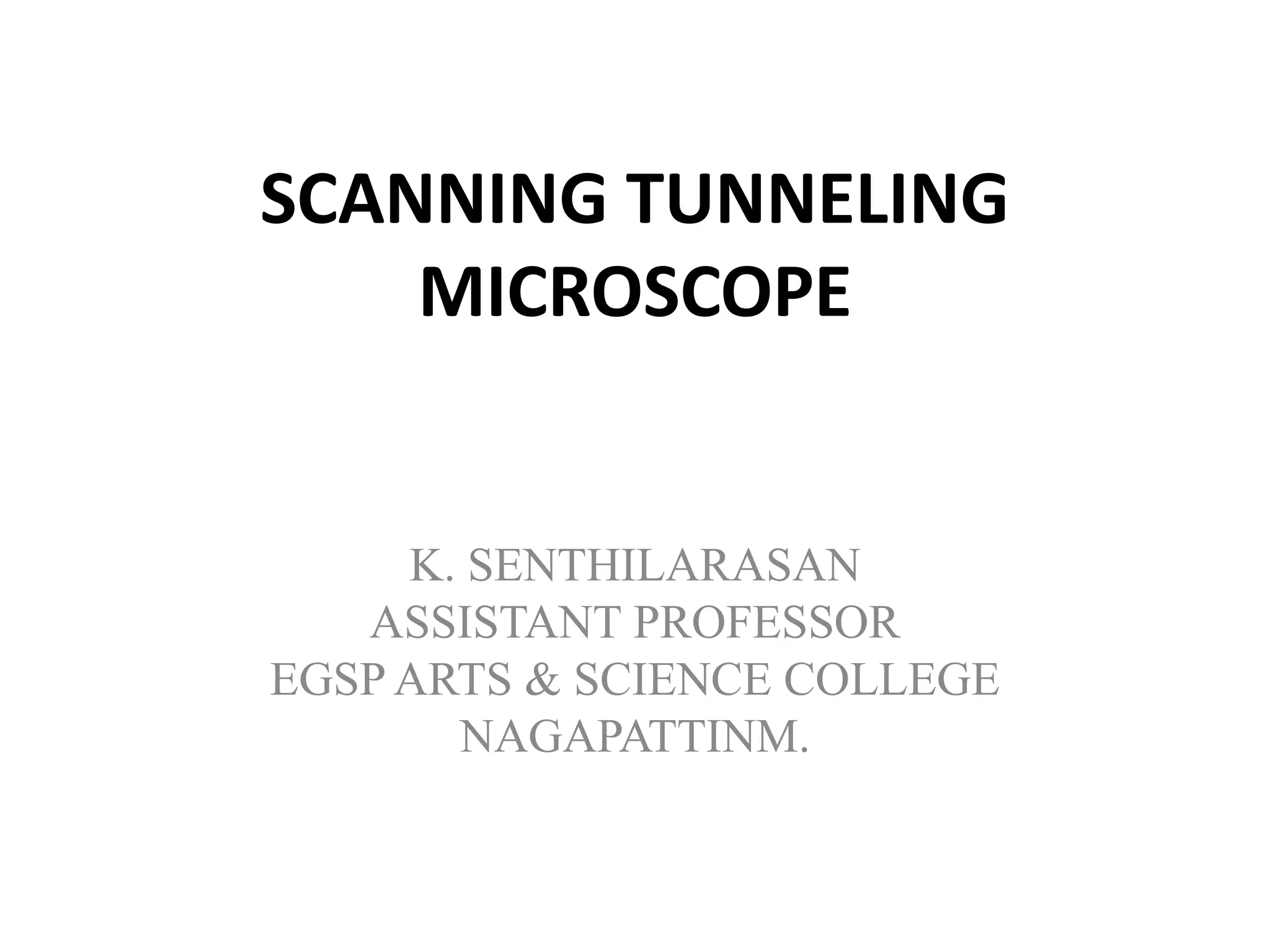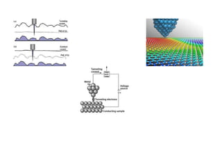 This document discusses the scanning tunneling microscope (STM). It begins by introducing STM and its ability to image surfaces with atomic resolution. It then explains the principle of STM, which uses a voltage applied between a metal tip and sample surface to create a tunneling current that is exponentially dependent on tip-sample separation. The document outlines the tip positioning system, describes the constant current and variable current imaging modes, and notes STM's advantages of high resolution and ability to study various environments and its disadvantage of requiring precise tip positioning and stable/clean surfaces.