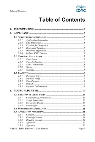 This document provides a table of contents for a user manual for the Short Term Open Access Software. The table of contents outlines chapters for the manual that cover information for different types of users: Chapter 2 for applicants, Chapter 3 for the nodal RLDC user, and Chapter 4 for other RLDC users. It provides high-level descriptions of the types of functions each user can perform in the software, such as submitting and tracking applications, processing applications, and exchanging consents between RLDCs.