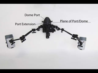 The document provides an overview of basic strobe positioning techniques for underwater photographers. It defines common housing and strobe equipment terms. It then gives guidelines for strobe placement in different situations, including macro, wide angle, and shooting vertical subjects. Strobe positioning is adjusted based on factors like subject distance, use of flat or dome ports, and the goal of avoiding hot spots or flares in the final image. Diagrams demonstrate the principles of pivoting strobes in and out and adjusting their height and distance from the housing for various photographic styles and conditions.