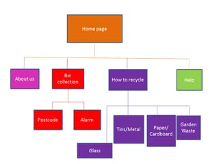 This document discusses a proposed mobile app called "BinzOut" that would help users remember when to put out their bins for collection and provide information on what items can be recycled. It would send alerts the day before bin collection and include a color-coded calendar of collection days. The app would also allow users to interact socially about recycling and finding used materials. It is intended to make recycling easier and promote community involvement.