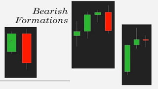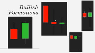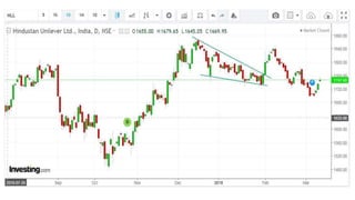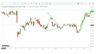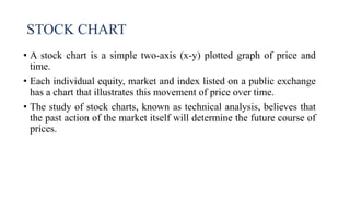 This document discusses stock charts and chart patterns. It begins by defining different types of stock charts, including line charts, bar charts, and candlestick charts. It then explains common chart patterns such as double tops and bottoms, head and shoulders, triangles, channels, and wedges. Key aspects of these patterns like support and resistance zones are described. The document provides examples of each pattern and discusses how technical analysts use patterns to potentially predict future price movements and identify reversal signals.