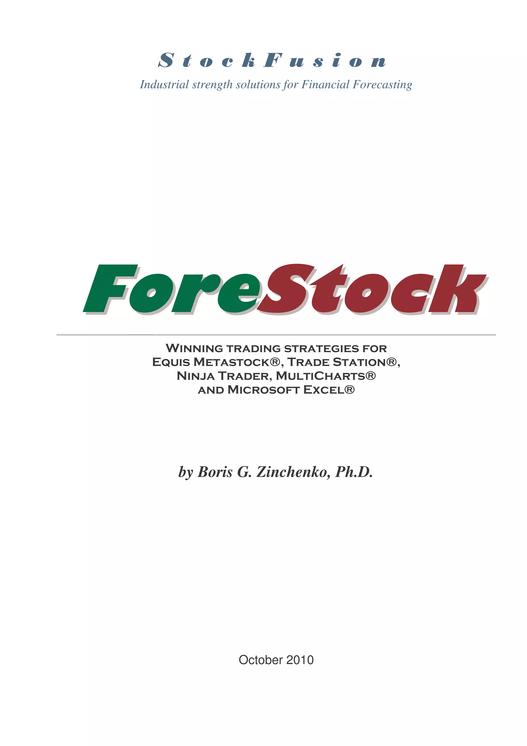 The document outlines Forestock, a state-of-the-art market forecasting technology designed to integrate with trading platforms like Tradestation, Metastock, Ninja Trader, and Excel. It provides innovative predictors and indicators based on advanced mathematical principles, enabling users to build personalized trading systems. Installation instructions and system requirements, along with a comprehensive list of algorithms and their respective trading capabilities, are also included.