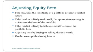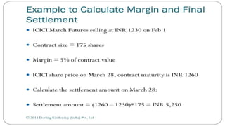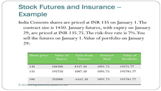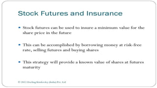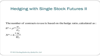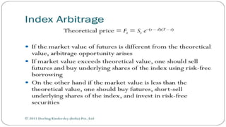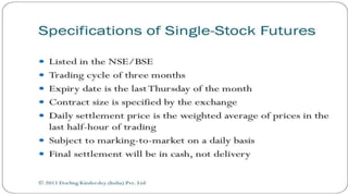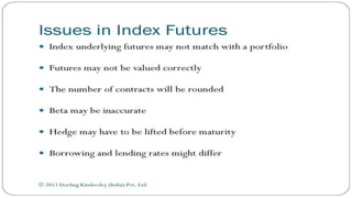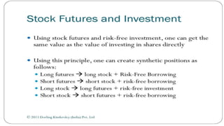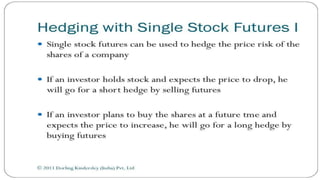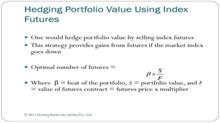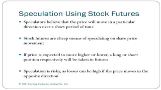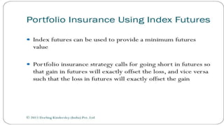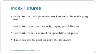 Index futures allow traders to speculate on the future price of a financial index or hedge their equity positions. They are contracts that let an investor buy or sell an index, such as the S&P 500, at a set price today for settlement at a future date. Both speculators and investment managers use index futures, with speculators betting on the market's direction and managers hedging their stock portfolios against potential losses.