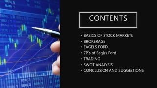 Eagles Ford is a stock brokerage firm based in Udaipur, India that was established in 2018. It offers various trading and investment services through different account types. The Classic Royal Account has brokerage fees ranging from 0.01-0.5% and account opening charges of Rs. 500, while the Eagle Trade Account has brokerage of 0.02% and opening charges of Rs. 700. Eagles Ford leverages both online and offline channels to reach customers. While it has a strong process for order execution and research capabilities, online listings have increased competition from individual home sellers and part-time agents.