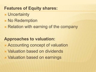 This document discusses various approaches to valuing equity shares, including accounting-based methods like book value and liquidation value, and dividend-based methods like the single-period, multi-period, and constant/variable growth dividend discount models. It also covers valuation using the price-earnings (P/E) ratio and models like Graham-Dodd and Whitbeck-Kisor that use factors like earnings, growth rates, and dividend yield to determine fair value.