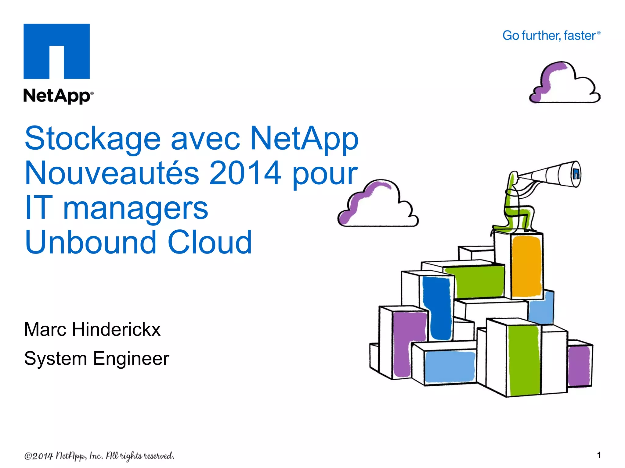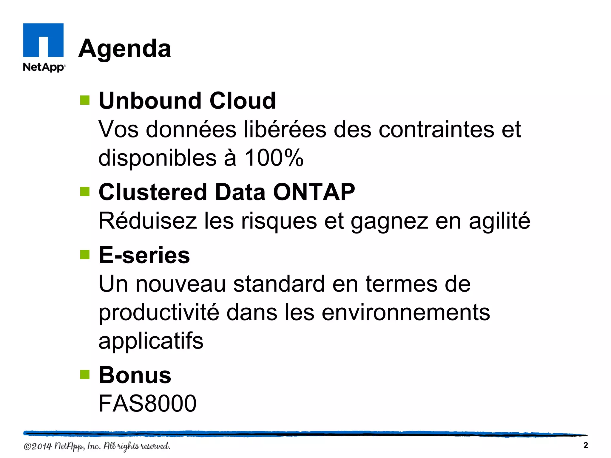 The document discusses NetApp's 2014 innovations in cloud data management, focusing on the Unbound Cloud strategy, Clustered Data ONTAP, and E-Series storage solutions. It highlights benefits such as reduced risks, increased agility, and seamless connectivity between private, public, and hybrid cloud environments. Key features include dynamic data portability, extensive customer choice, and efficient resource management for diverse IT workloads.