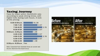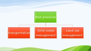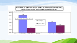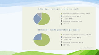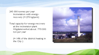 Stockholm is the capital of Sweden located on the Baltic Sea. It has a population of 820,000 residents within an area of 209 square kilometers, 40% of which consists of parks and recreational areas. Public transportation in Stockholm is highly developed, with 90% of residents living within 300 meters of frequent service. The city also encourages biking and walking through extensive bike lanes and by being compactly designed across 14 islands. Stockholm has implemented various policies and initiatives to become one of the world's most sustainable cities, such as a congestion tax, clean vehicles, renewable energy powered public transit, and an innovative waste management system.
