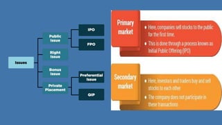 - The document discusses the stock market and provides information on key concepts like shares, shareholders, IPOs, and trading.