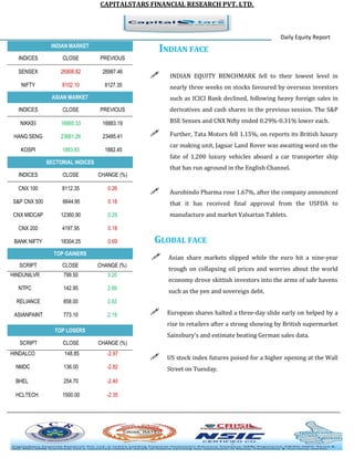 - Indian equity benchmarks fell to their lowest levels in nearly three weeks due to heavy foreign sales in derivatives and cash shares. Key stocks like ICICI Bank declined.