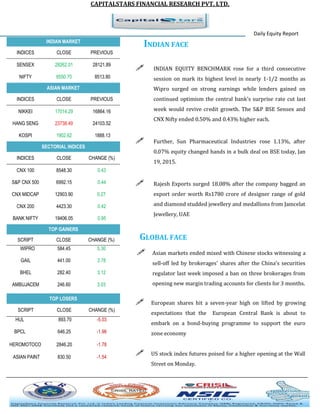 The document is a daily equity report published by Capitalstars Financial Research Pvt. Ltd. on January 20th, 2015. It provides summaries of the performance of the Indian, Asian and European stock markets. It also lists the top gainers and losers among Indian stocks. Specific news is mentioned regarding quarterly results of companies like Wipro, V-Guard and HUL. The RBI considering allowing banks to purchase infrastructure bonds is also noted.