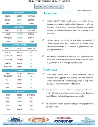 The daily equity report from Capitalstars Financial Research provides an overview of the Indian and global markets. In India, key indices rose to record highs supported by stimulus from the ECB. Biocon and Tata Metaliks shares fell after reporting declines in quarterly profits. In global markets, Asian shares rose on risk appetite boosted by the ECB bond-buying plan, while European shares extended gains. The report also provides sector performances, notable share price movements, and FII/DII activity for the day.