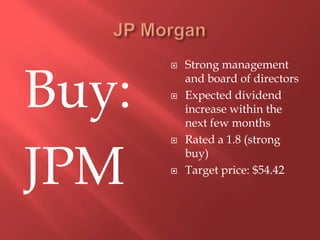 The document recommends buying stocks in three companies - JP Morgan, PNC Financial, and Affiliated Managers Group. For each company, it provides reasons for the recommendation, including strong leadership, expected dividend increases, analyst ratings and buy recommendations, and share price growth over the previous year.