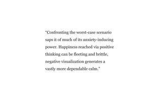 This document contains multiple excerpts and passages from Stoic philosophers discussing key concepts in Stoicism such as tranquility, indifference, negative visualization, controlling one's interpretations and judgments, focusing on virtue over external things, and maintaining equanimity through difficult circumstances. The excerpts promote cultivating calmness and resisting anxiety through accepting what is beyond one's control, examining one's thoughts and judgments, and finding contentment from within rather than through external things.