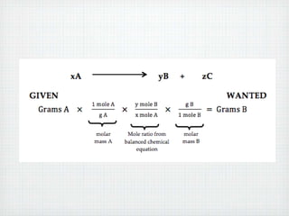 This document provides an overview of moles, molar mass, and stoichiometry. It defines a mole as 6.02x1023 particles of an element or compound. Avogadro's number is equal to this quantity of particles. Molecular mass is the mass of one molecule in atomic mass units (amu) while molar mass is the mass of one mole of a substance in grams. Examples are given for calculating molecular and molar mass. The document then discusses balancing chemical equations and using molar ratios from balanced equations to solve stoichiometry problems involving moles, grams, and particles of reactants and products.