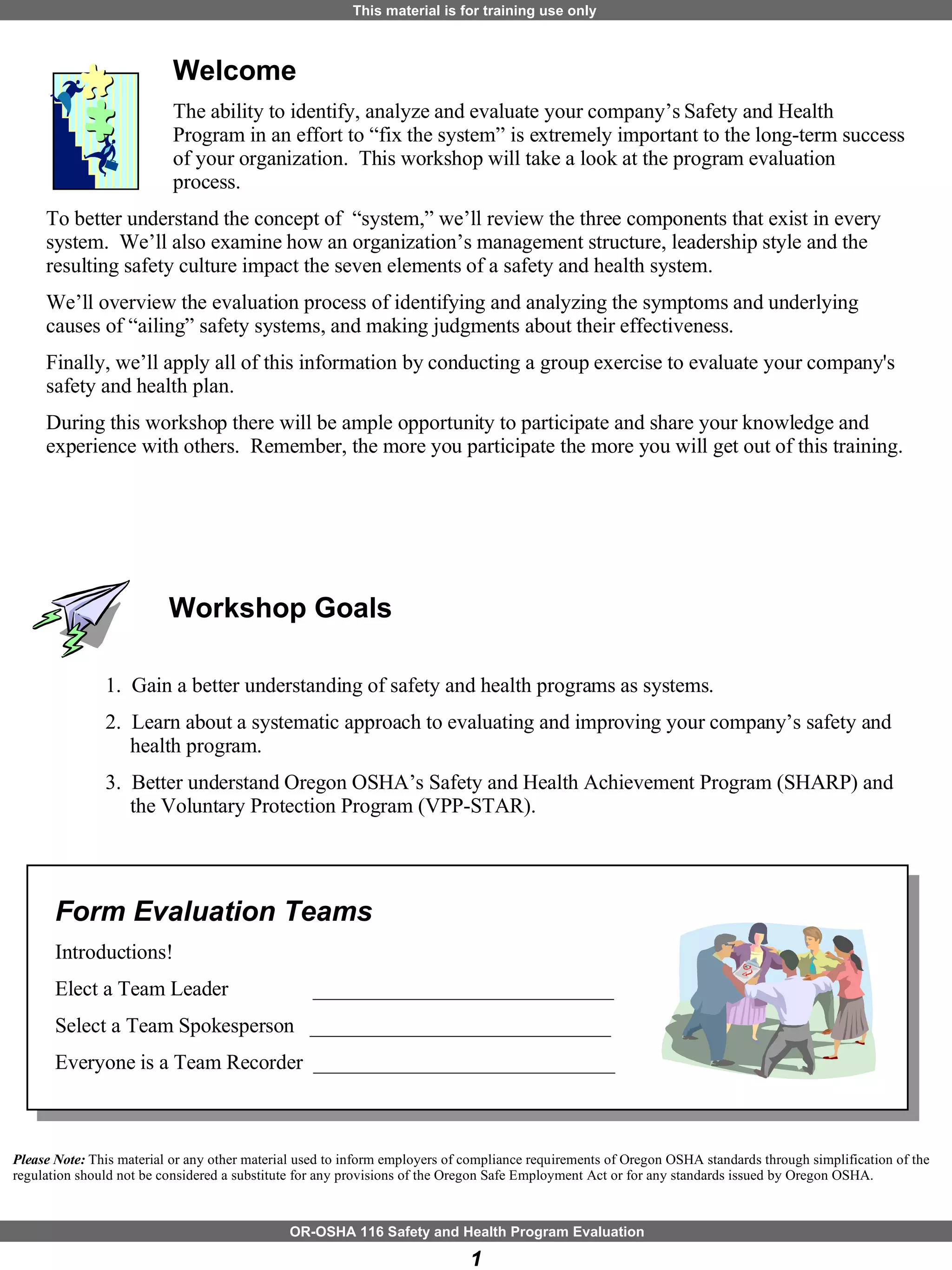 The document provides information about evaluating a company's safety and health program. It discusses evaluating the program as a system with inputs, processes, and outputs. It describes analyzing symptoms and underlying causes of issues, and making judgments about effectiveness to improve the program. The goal is to help participants better understand how to systematically evaluate their company's safety and health plan.