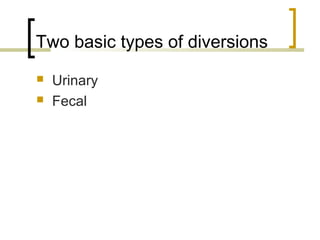 This document provides information on various types of stoma diversions including urinary and fecal diversions. It describes the reasons for diversions, types of urinary diversions including incontinent diversions like ileal conduits and continent diversions like Kock pouches. It also describes types of fecal diversions including incontinent diversions like colostomies and continent diversions like ileoanal reservoirs. Postoperative nursing care focuses on assessing the stoma, protecting the skin, and helping the patient adapt psychologically.