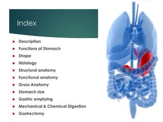 This document provides an overview of the stomach, including its description, functions, shape, histology, structural and functional anatomy, gross anatomy, size, emptying process, and role in mechanical and chemical digestion. It also discusses gastrectomy procedures including total and subtotal gastrectomies and their common aftereffects. Comparisons are made between stomach anatomy in different animal species. References include anatomy textbooks, peer-reviewed articles, and websites.