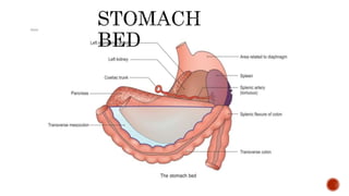 The document provides an in-depth overview of the stomach, detailing its anatomy, functions, and clinical relevance. It explains its physical structure, including orifices, curvatures, and surfaces, as well as its role in digestion and conditions such as ulcers and cancer. The document also covers the stomach's blood supply, peritoneal relations, and visceral connections with surrounding organs.