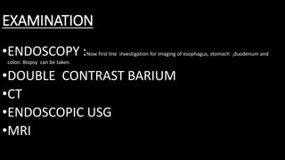 This document discusses the radiological anatomy and pathologies of the stomach. It begins with an overview of examination techniques including endoscopy, barium meal, CT, and endoscopic ultrasound. It then describes the anatomy of the stomach and surrounding structures. The main pathologies discussed are gastritis, peptic ulcer disease, neoplasms, and congenital anomalies. For inflammatory conditions like gastritis and peptic ulcers, the document outlines imaging findings and distinguishing features of different types. It similarly discusses imaging features that help differentiate benign from malignant ulcers.