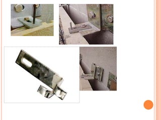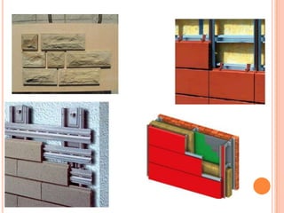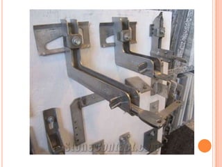 The document discusses stone cladding for building facades. It recommends using corrosion-resistant materials for anchors and fixings. For facade heights, it recommends less than 28m if joints are mortared and less than 18m if not. It specifies diameters and materials for corrosion-resistant ties between 5-6mm depending on stone thickness. It also recommends a minimum 2cm ventilated air space between the stone cladding and building support. Anchors can be fixed in the support by embedding in mortar or with stainless steel wedges compatible with the tie material.