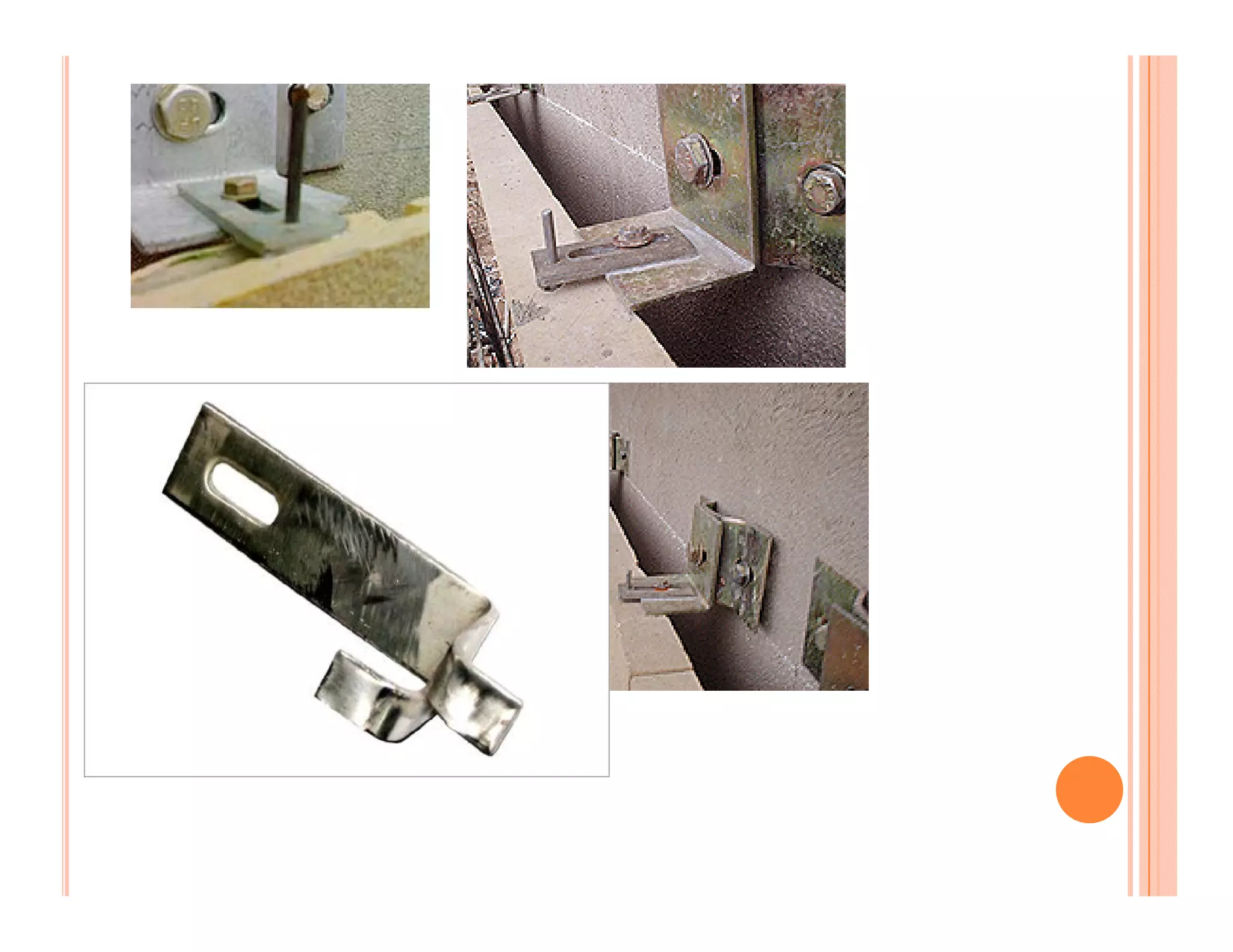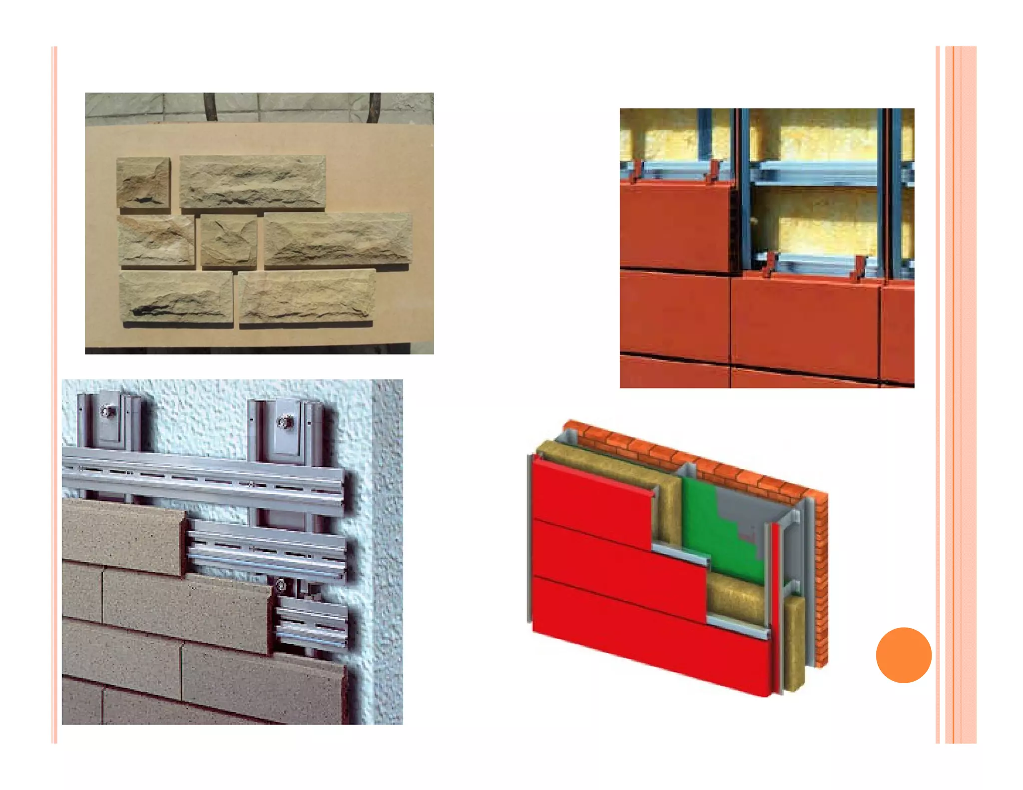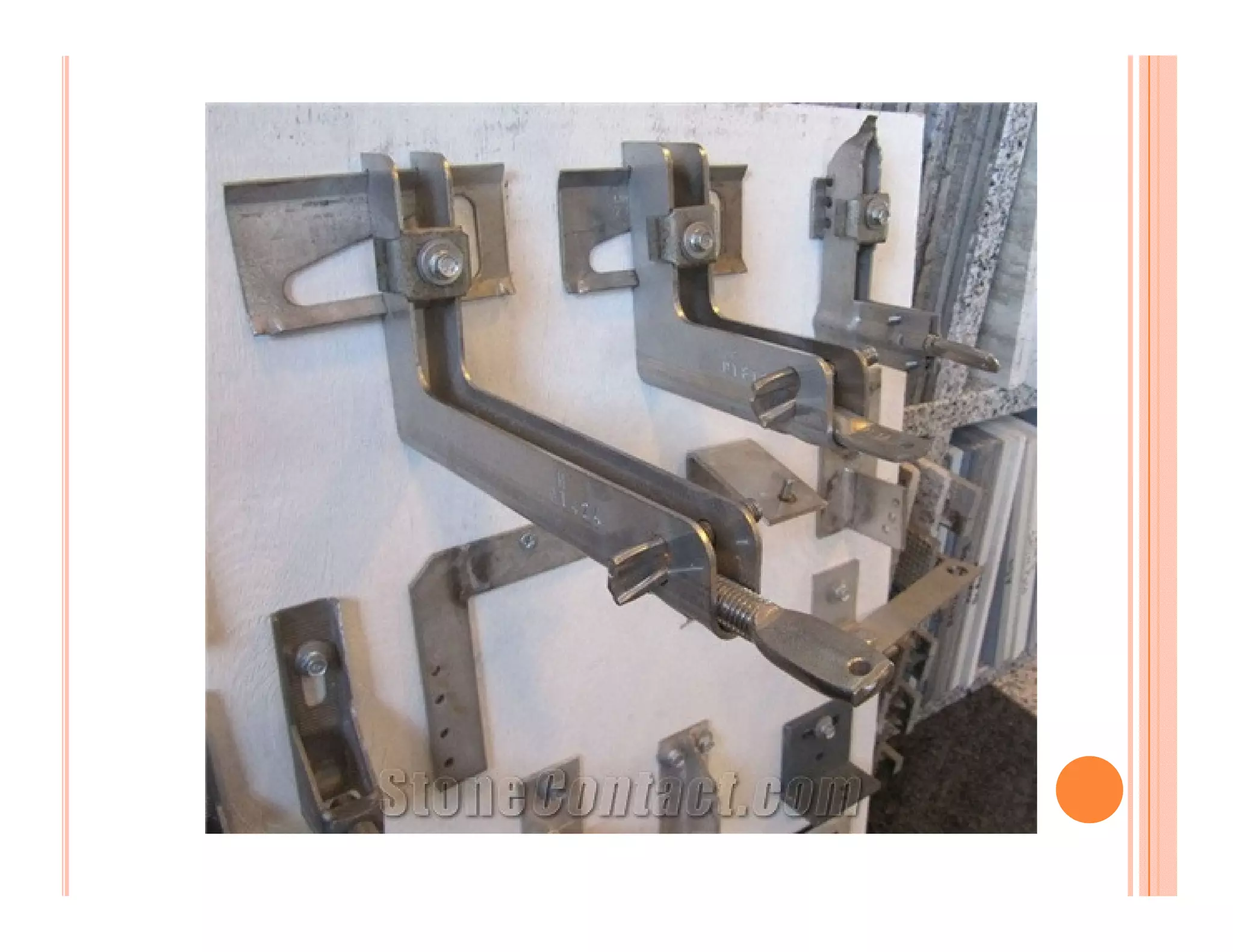 The document discusses stone cladding for building facades. It recommends using corrosion-resistant materials for anchors and fixings. For facade heights, it recommends less than 28m if joints are mortared and less than 18m if not. It specifies diameters and materials for corrosion-resistant ties between 5-6mm depending on stone thickness. It also recommends a minimum 2cm ventilated air space between the stone cladding and building support. Anchors can be fixed in the support by embedding in mortar or with stainless steel wedges compatible with the tie material.
