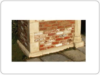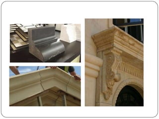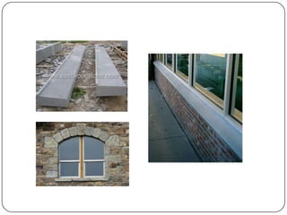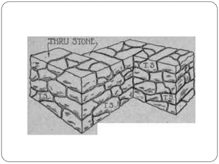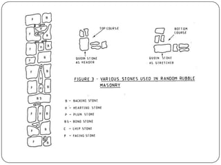Stone masonry uses stones bonded together with mortar to construct various building components such as walls, columns, foundations, arches and lintels. Stones are selected based on availability, ease of working, appearance, strength, polishing characteristics and economy. There are two main types of stone masonry - rubble masonry which uses roughly dressed stones with wider joints, and ashlar masonry which uses accurately dressed stones with fine, uniform joints. Rubble masonry includes uncoursed, coursed, random, dry and polygonal styles based on stone arrangement. Ashlar masonry has fine, rough, rock-faced, block and chamfered styles based on stone dressing. Stone