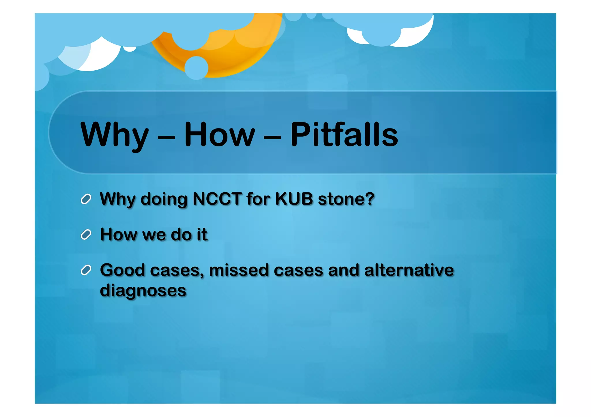 The document discusses the CT stone protocol, focusing on the reasons for using non-contrast CT for detecting kidney stones, the sensitivity and specificity of various imaging methods, and diagnostic strategies for assessing uncomplicated ureteral stones. It highlights the importance of stone composition, detection methods, and a proposed stone score to evaluate the probability of symptomatic stones. Additionally, it addresses radiation doses associated with CT scans and the interpretation of the imaging findings related to stone formation.