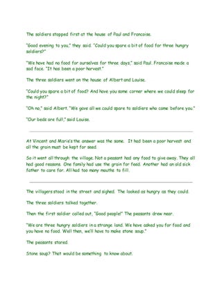 Three hungry soldiers arrive in a village and are refused food by the fearful peasants. They propose to make 'stone soup' and persuade the villagers to contribute ingredients, leading to a grand feast. The villagers learn a valuable lesson about sharing and community, realizing they can create abundance together.