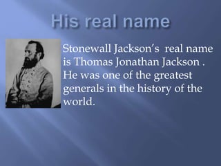 Thomas Jonathan Jackson, also known as Stonewall Jackson, was one of the greatest generals in the history of the Civil War. He was born in 1824 in Virginia to a lawyer father and homemaker mother. During the Civil War, Jackson proved himself an effective strategist and leader, though he was accidentally shot by his own men at the Battle of Chancellorsville in 1863 and later died of complications from his injuries.