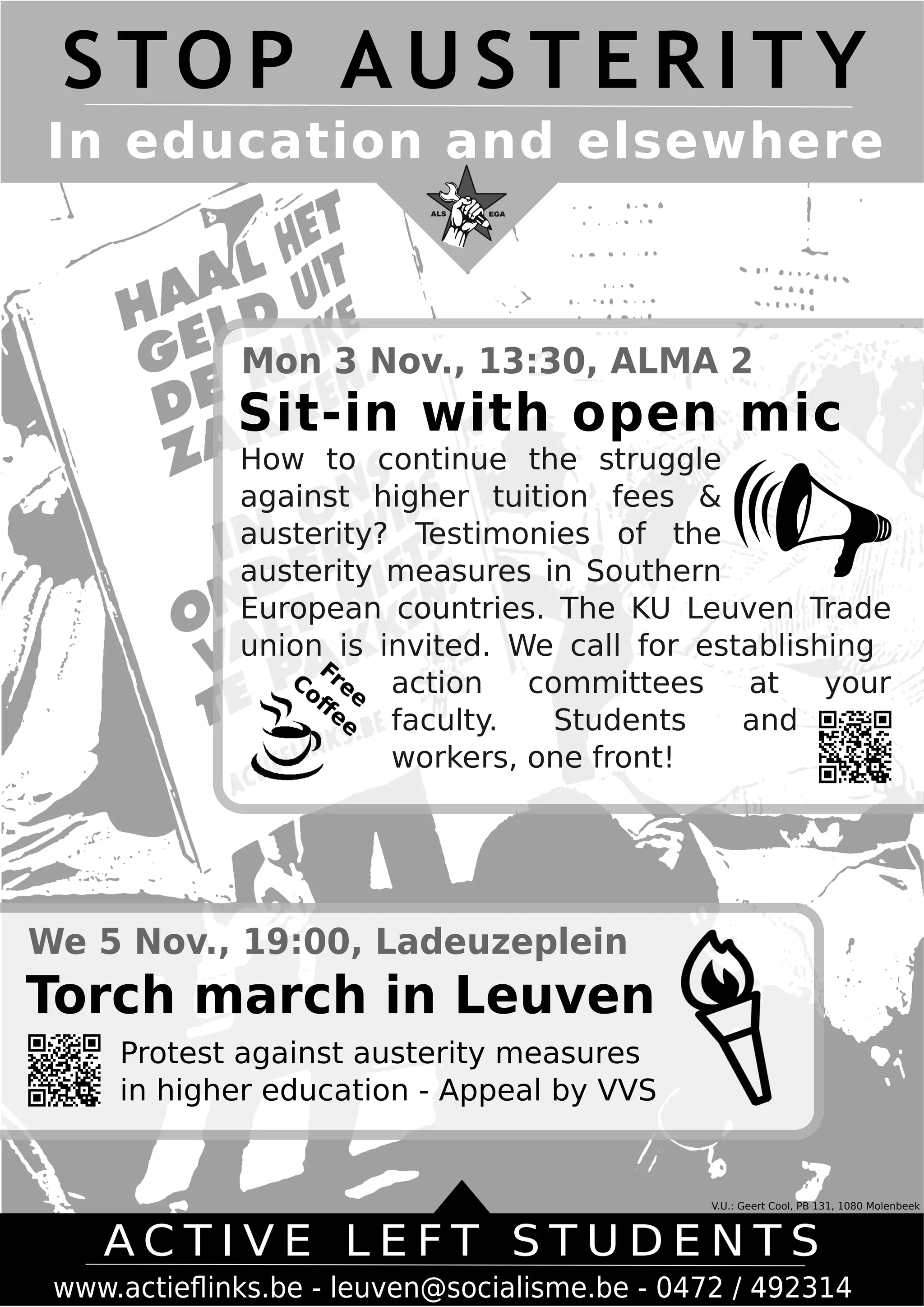 The document announces two protests against austerity measures - a sit-in with an open mic on November 3rd at ALMA 2 to discuss how to continue struggling against higher tuition fees and austerity, featuring testimonies from Southern European countries impacted by austerity. It also announces a torch march in Leuven on November 5th at Ladeuzeplein to protest austerity measures in higher education. It calls for students and workers to unite in action committees at each faculty and provides contact information for Active Left Students.