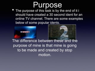 This document provides details for an animation pitch for a 30 second ident for an online TV channel called Bubblextra, which targets ages 8-14. The ident will be created using stop motion animation with playdough. It outlines the concept, characters, colors, lighting, limitations, storyline, audio considerations, continuity, and importance of smooth movement. The ident will feature a green monster, purple octopus, and group of red clay men interacting to represent the channel and its programs.