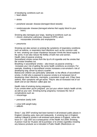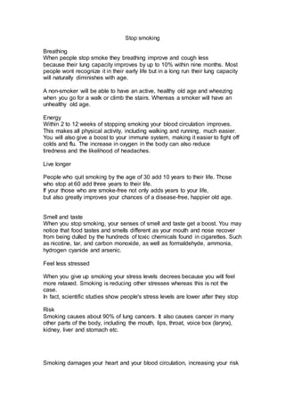 Stopping smoking has numerous health benefits. Within a year of quitting, lung capacity can improve by 10% as coughing lessens and breathing becomes easier. Those who quit by age 30 add 10 years to their life expectancy. Quitting smoking also reduces stress levels, improves senses of taste and smell, and lowers the risk of many cancers and heart or lung diseases. Secondhand smoke increases risks of lung cancer, heart disease, and respiratory illnesses for non-smokers as well. Smoking during pregnancy can cause complications like premature birth and low birthweight for the baby.