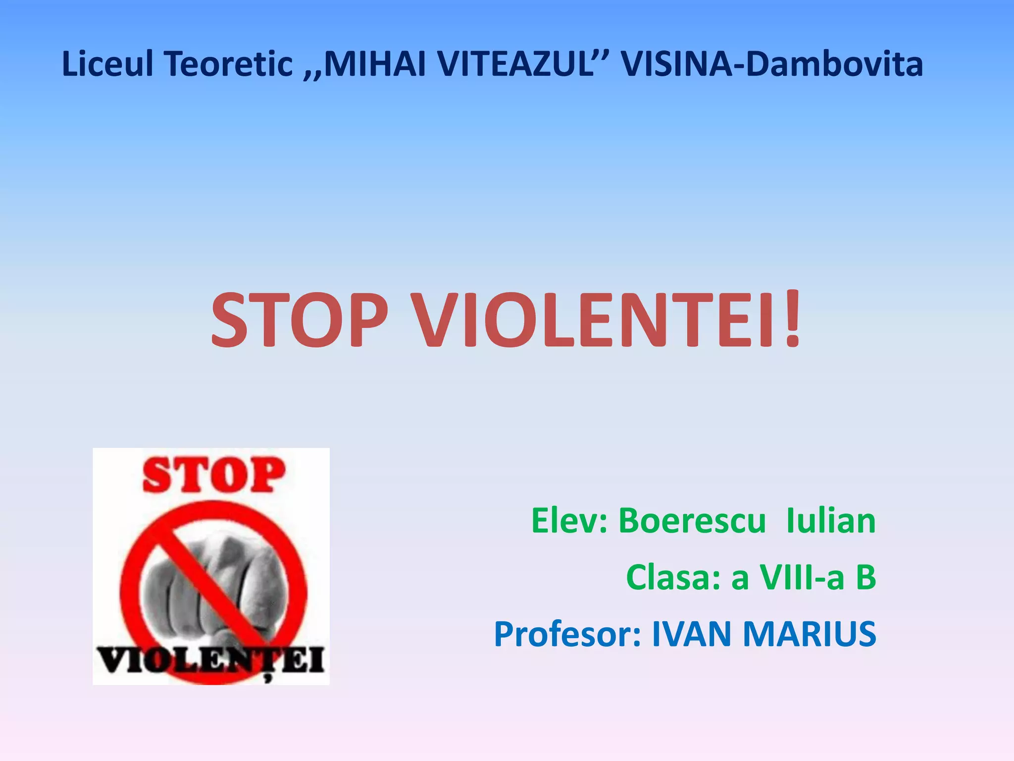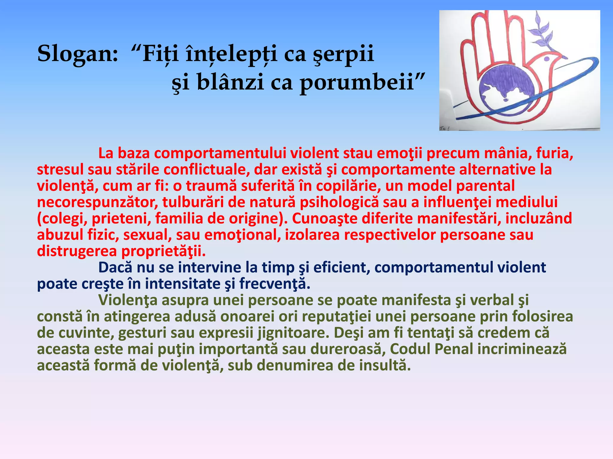 Documentul discută despre violența în diverse forme și manifestări, inclusiv abuz fizic, emoțional, sexual și verbal, subliniind emoțiile care stau la baza acestora, cum ar fi mânia și stresul. De asemenea, se evidențiază importanța intervenției rapide și a abordării amiabile în fața violenței, precum și faptul că toți pot deveni victime. În final, se face apel la o comportare mai bună între oameni și la conștientizarea impactului acestor comportamente.