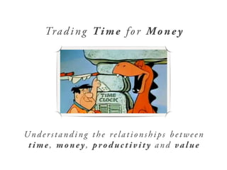 The document discusses the relationship between time, money, productivity, and value, emphasizing the importance of focusing on productivity rather than merely tracking hours worked. It critiques traditional time management practices, such as timesheets, and advocates for measuring productivity through results and the value created. Additionally, it outlines how productivity can drive growth and improve workplace culture by attracting talent that thrives in a non-restrictive environment.