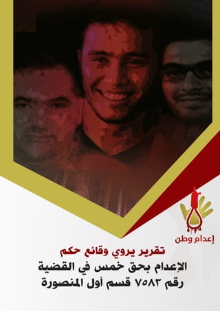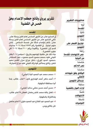 تتعلق الوثيقة بقضية إعدام خمسة متهمين بتهم تتعلق بالقتل والانتماء لجماعات إرهابية. تشمل الوثيقة تفاصيل عن الاتهامات، المحاكمة، والشهادات المقدمة ضد المتهمين، بالإضافة إلى الحكم النهائي الصادر ضدهم. تتضمن القضية عناصر تتعلق بالتحقيقات والأدلة المقدمة من النيابة العامة.
