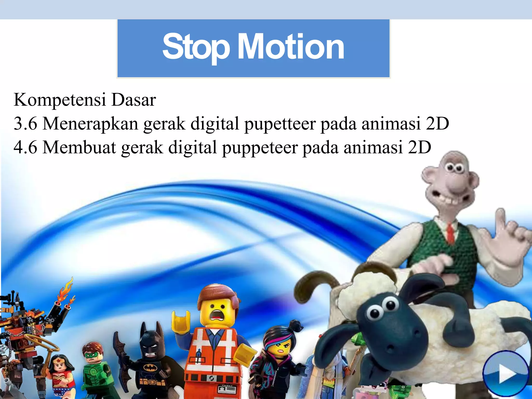 Dokumen ini menjelaskan tentang teknik animasi stop motion, termasuk pengertian, sejarah, jenis-jenis, kelebihan dan kekurangan, serta langkah-langkah pembuatannya. Berbagai jenis teknik stop motion seperti claymation, cutout, dan pixilation dibahas dengan penjelasan tentang alat dan bahan yang dibutuhkan. Ringkasan ini memberikan wawasan tentang sejarah perkembangan animasi stop motion dan proses kreatif yang terlibat dalam pembuatannya.